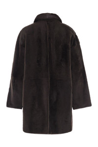 Of Spanish origin, the material used is characterised by its lightness. The wool side is soft and, in its natural state, is characterised by a distinctive small curl that becomes straightened and shiny through craftsmanship. Silhouette: Shirt-style model, easy to wear. Reversible. Essential. Extremely lightweight. - Reversible garment - Dotted pocket trim - Nappa leather edging - Horn snap buttons on the front for concealed fastening - Garment length 85 cm DESIGNER ID: 2521416015600 002 Gender: Women Material: 100% SHEEPSKIN Color: Brown Made in: Italy Product ID: 2521416015600 002 *Import tax/duty will be calculated at checkout (If applicable)