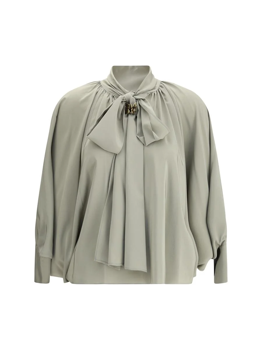 DETAILS Blouse with loose, feminine volumes and wide raglan batwing sleeves. Pure silk crepe de Chine blouse V-neck and foulard collar that ties in a bow Deep cuffs with covered side button Seam motif at the centre back Removable metallic jewel loop Asymmetrical hem that is longer at the back COMPOSITION AND CARE 100% silk. Do not wash; do not bleach; do not tumble dry; cool iron; professionally dry clean perchloroethylene - mild process; do not wet clean.; do not iron the buttons.; protect buttons before washing.; turn the articles inside out before washing.; remove metal parts before washing. Distributed by Max Mara S.r.l., registered office in Reggio Emilia (Italy), Via Giulia Maramotti 4, 42124 (IT)