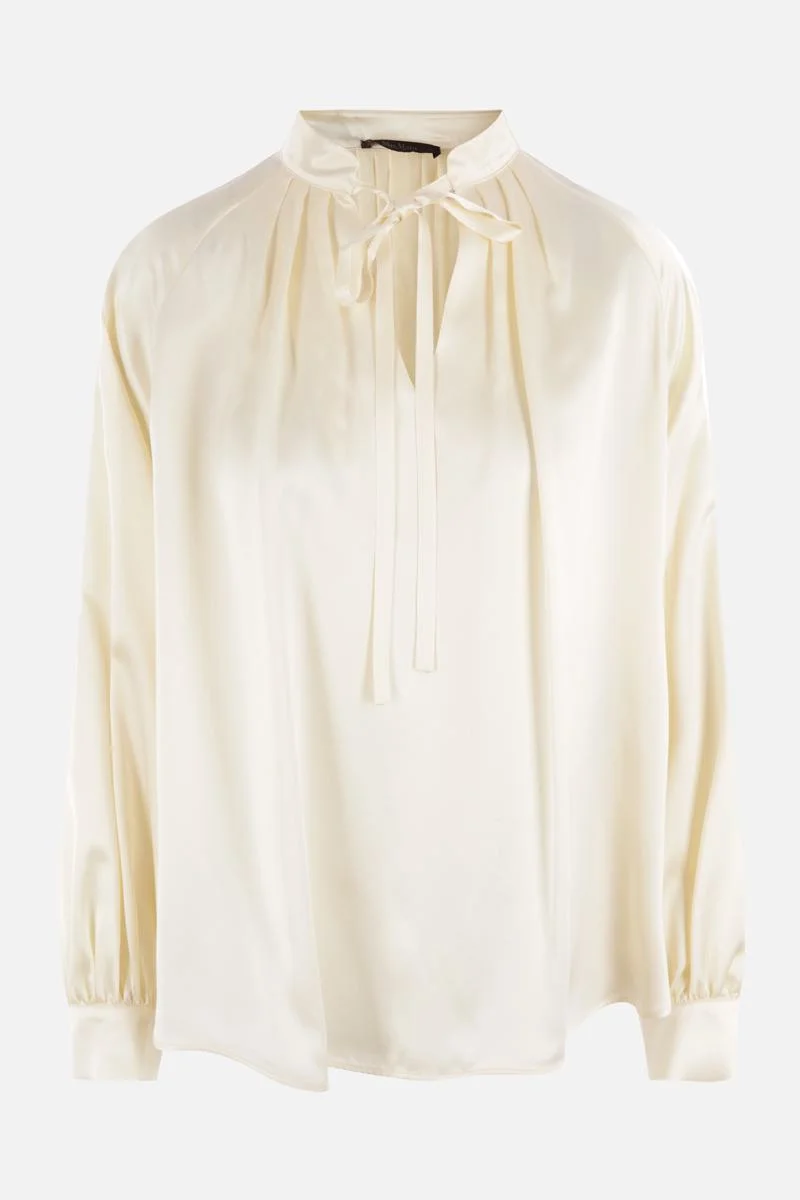 Max Mara's blouse crafted in ivory silk satin. It features crew neck with tied closure, long sleeves with buttoned cuffs and curved hem. Gender: Women Material: 100% SILK Color: IVORY Made in: PT Product ID: 231116023760010133032 *Import tax/duty will be calculated at checkout (If applicable)