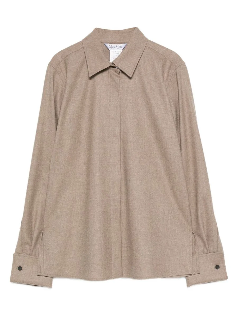 Max Mara Shirt with buttoned cuffs Origin: Italy Features Taupe collared neckline long sleeves buttoned cuffs buttoned front closure straight hem Composition 100% cashmere Gender: Women Material: 96% CASHMERE CAPRA HIRCUS HIRCUS CINA, 04% ELASTANE Color: Beige Made in: Italy Product ID: 2521116042600257002 *Import tax/duty will be calculated at checkout (If applicable)