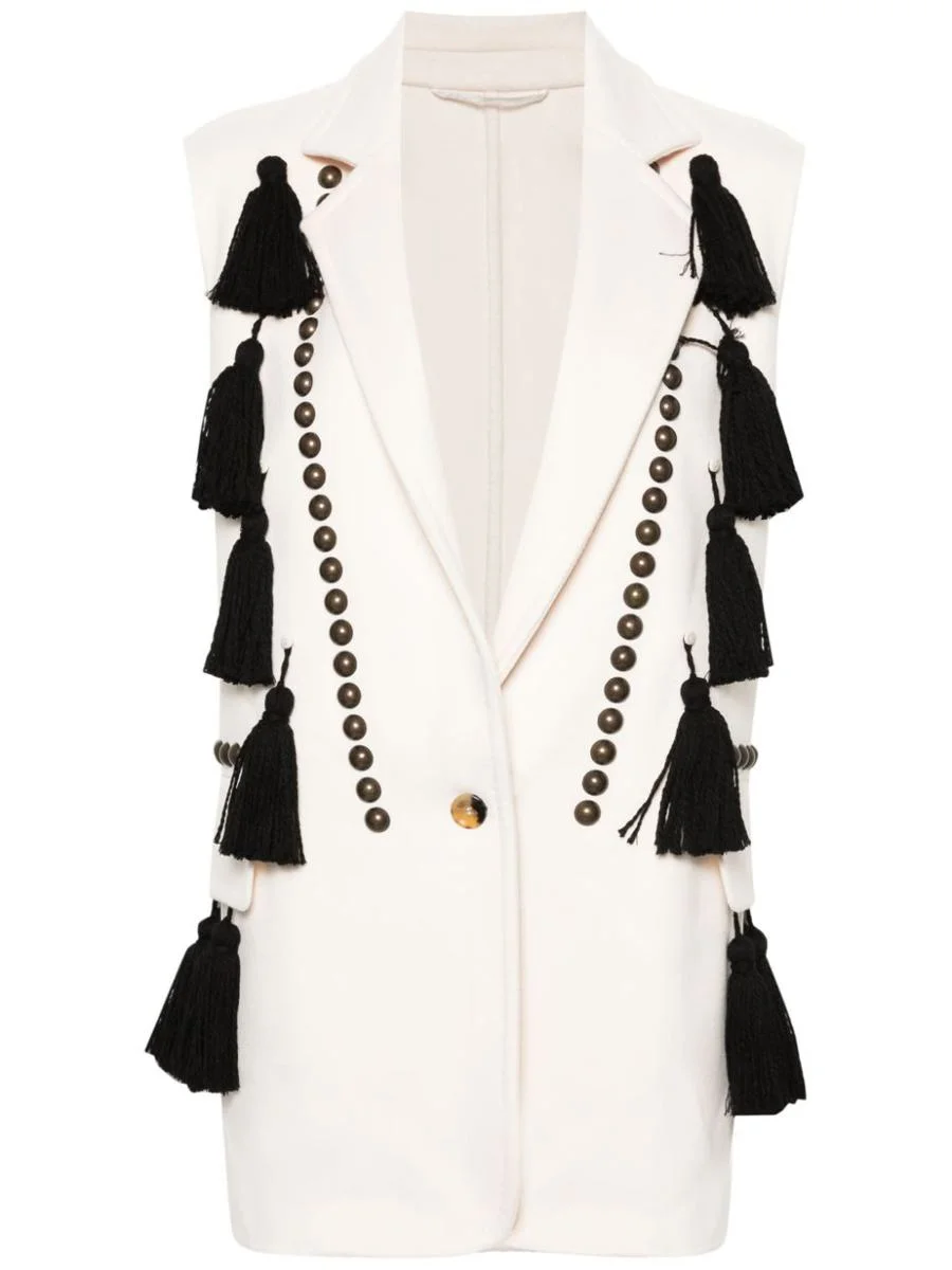 cream white virgin wool-cashmere blend felted finish large tassel detail stud embellishment notched lapels sleeveless two front flap pockets unlined front button fastening This piece fits true to size. We recommend you get your regular size Model is 1,75m / 5ft 8in wearing size 40 (IT) Gender: Women Material: VIRGIN WOOL 80% CASHMERE 20% Color: WHITE Made in: IT Product ID: 11281011600015 *Import tax/duty will be calculated at checkout (If applicable)