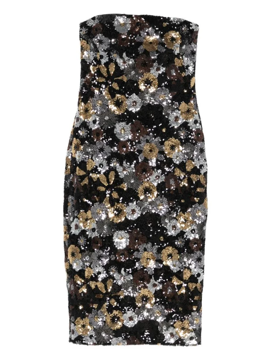 Back zip closure Straight neckline; Strapless Multicolor floral pattern with all-over embroidered sequins Center back slit Midi and fitted fit Color: Black 100% Polyester Gender: Women Material: 100% POLYESTER Color: Black Made in: Imported Product ID: 2526226044600001 *Import tax/duty will be calculated at checkout (If applicable)