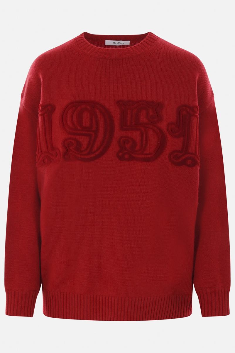 Max Mara oversize sweater made of red wool and cashmere knit with a flocked 1951 motif on the front. It has a crew neck, long sleeves, ribbed edges and a straight hem. Gender: Women Material: FABRIC 70% WOOL OVIS ARIES ARIES, 30% CASHMERE CAPRA HIRCUS HIRCUS CINA Color: RED Made in: Imported Product ID: 251136119160010038038 *Import tax/duty will be calculated at checkout (If applicable)