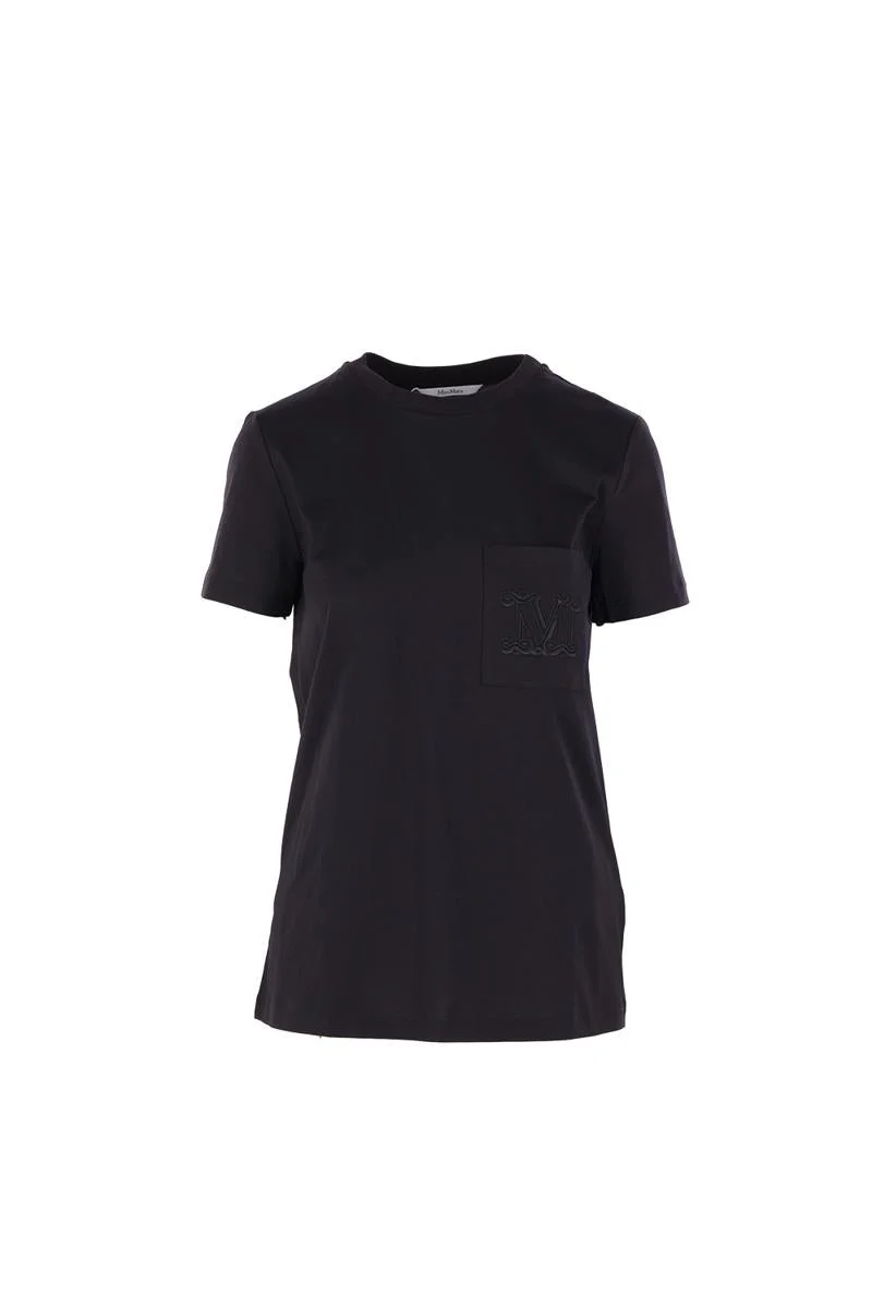 Max Mara t-shirt crafted from black cotton jersey with embroidered M monogram on the chest pocket. Featuring crew neckline, short sleeves, and straight hem. Gender: Women Material: FABRIC 100% COTTON Color: Black Made in: Imported Product ID: 2521946041600112002 *Import tax/duty will be calculated at checkout (If applicable)