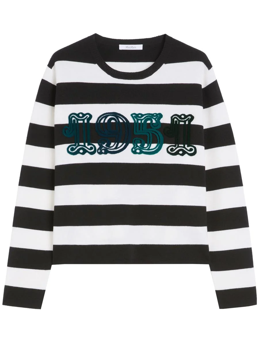 Striped lightweight pure wool sweater with boxy fit and long dropped shoulder sleeves. "1951" flocked embroidery on the front for a distinctive touch. Warm, modern and perfect. Add it to your cart now. Gender: Women Material: WOOL | 100% VIRGIN WOOL Color: MULTICOLOUR Made in: Imported Product ID: 2521366091600_007 RIGA 5X5 BIANCA E NERA 1951 MULTICOLOR *Import tax/duty will be calculated at checkout (If applicable)