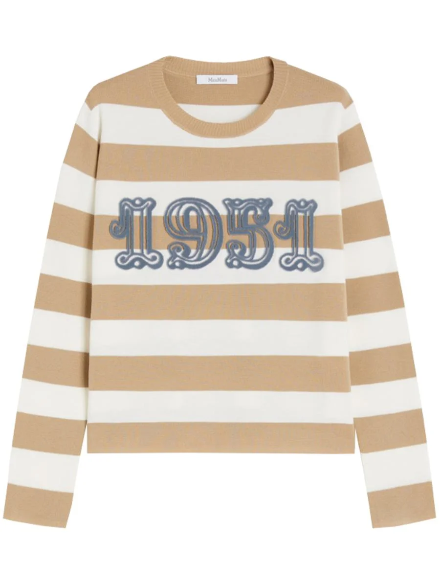 Striped lightweight pure wool sweater with boxy fit and long dropped shoulder sleeves. "1951" flocked embroidery on the front for a distinctive touch. Warm, modern and perfect. Add it to your cart now. Gender: Women Material: WOOL | 100% VIRGIN WOOL Color: MULTICOLOUR Made in: Imported Product ID: 2521366091600_008 RIGA 5X5 BIANCA E POMICE 1951 AZZURRO *Import tax/duty will be calculated at checkout (If applicable)