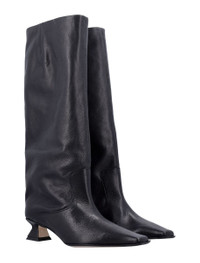 The Miista Effie boot redefines elegance with its sculptural heel and minimalist silhouette. Crafted in supple black leather, this knee-high design features a softly slouched shaft and sharply pointed toe for a contemporary finish. Grounded by a unique curved heel, it brings directional edge to both day and evening looks. Premium black leather upper Knee-high silhouette with soft slouch Square toe for a sharp finish Sculptural mid-height heel Slip-on design Heel: 4,5 cm Gender: Women Material: 100% LEATHER Color: Black Made in: Portugal Product ID: 25AMI5871#BLACK *Import tax/duty will be calculated at checkout (If applicable)