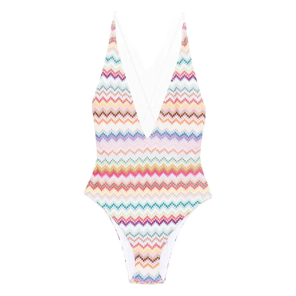 One-piece swimsuit in lamé viscose with pixel-effect zigzag pattern and V-neckline