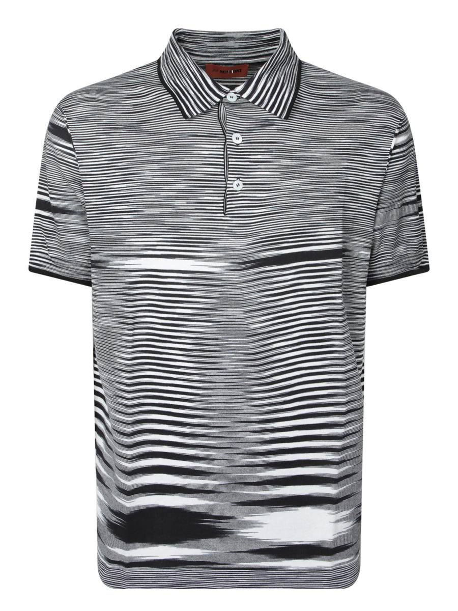 Short sleeve polo. Split stripe pattern. Classic collar with three-button placket. This exclusive Missoni knit polo featuring a split stripe pattern merges contemporary style with supreme comfort. Finished with a knit collar and straight hem, it's perfect for a refined causal look. Gender: Men Material: 100%COTTON Color: Black Made in: Imported Product ID: UC22W204 BK013B F9026 *Import tax/duty will be calculated at checkout (If applicable)