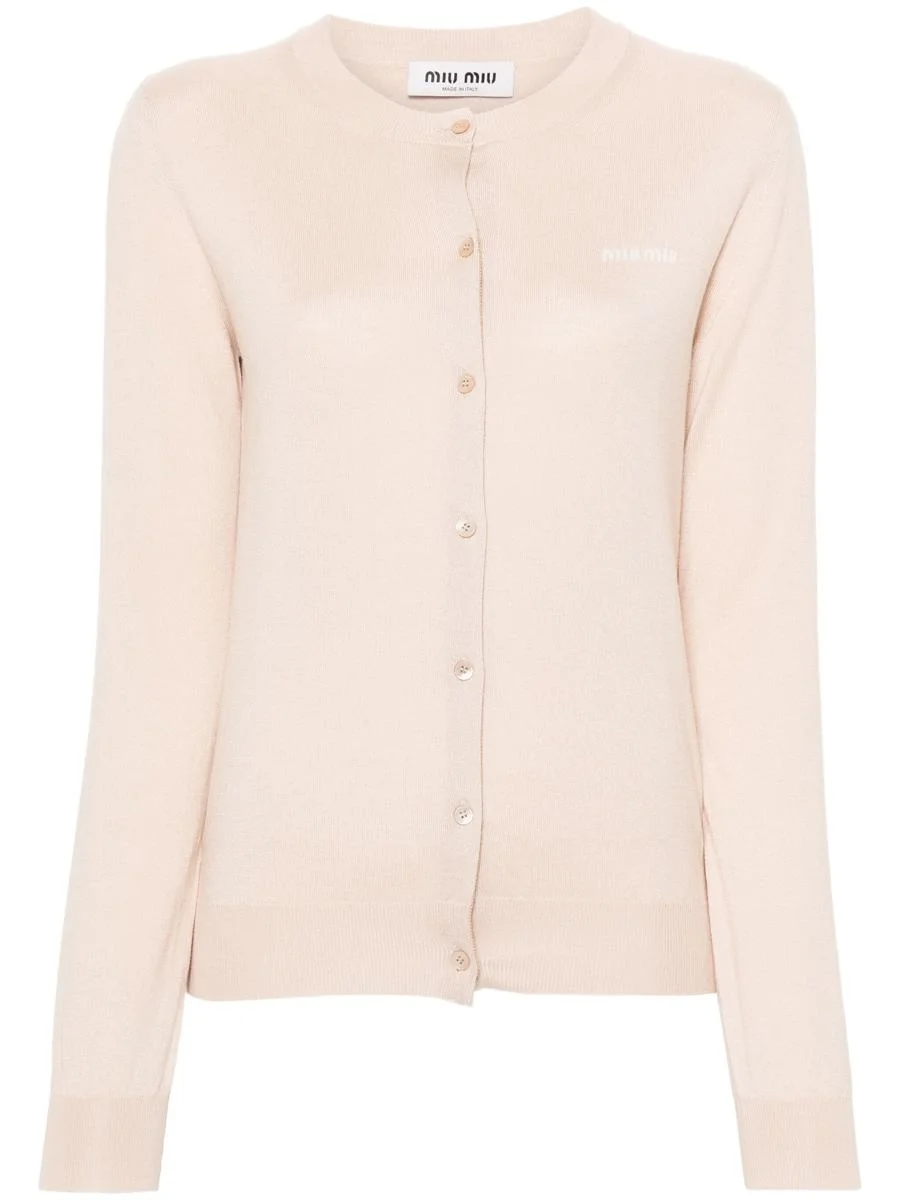 Highlights light pink/white cashmere-silk blend fine knit intarsia-knit logo crew neck front button fastening long sleeves ribbed cuffs and hem This item contains at least 50% materials which are certified or widely recognised as having a lower environmental impact through production and/or manufacturing processes that reduce water consumption and the use of harmful chemicals, or re-use by-products of the production process.   Composition Cashmere 70%, Silk 30% Gender: Women Material: 30%SILK 70%CASHMERE-100%TROCHUS NILOTICUS Color: Beige Made in: Imported Product ID: MMF878SOOO13KW F0627 ALBINO *Import tax/duty will be calculated at checkout (If applicable)