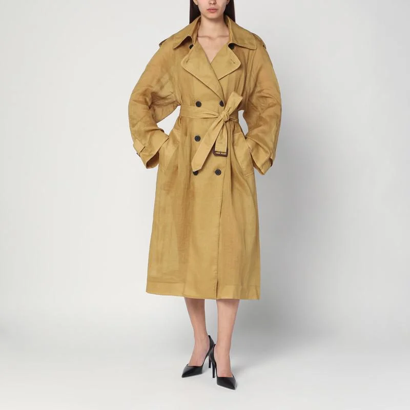 Double-breasted trench coat by MKDT Studio in olive gold ramie, characterized by front buttoning, wide lapels, epaulettes on the shoulders, two side welt pockets, adjustable waist belt, and long sleeves with buttoned cuffs. Gender: Women Material: 100% Ramie Color: GREEN Made in: Imported Product ID: 25-2-113-3952CO/Q_MKDT-GO *Import tax/duty will be calculated at checkout (If applicable)