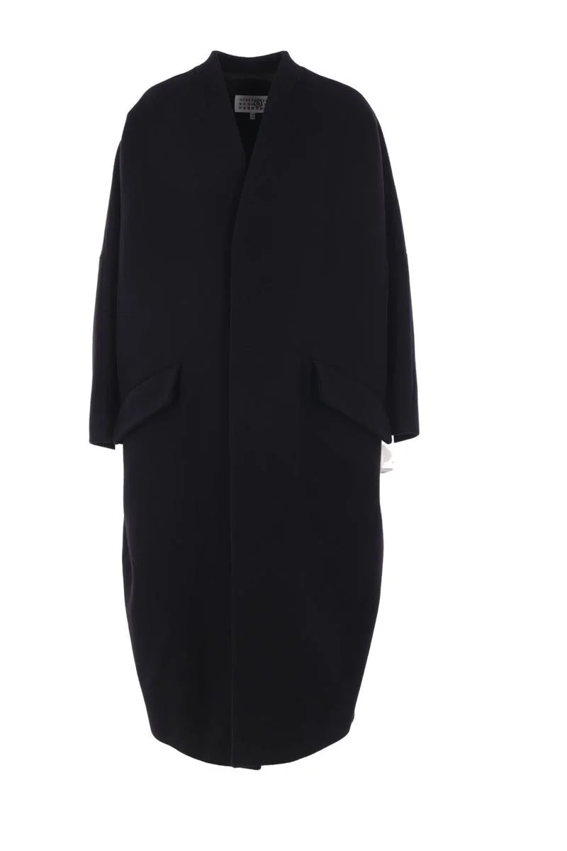 MM6 oversized coat crafted from black wool-blend cloth. Featuring a V-neckline, concealed front button closure, flap pockets, long sleeves with dropped shoulders, armhole openings, straight hem, and a fully lined interior. The design is finished with the Maison’s signature white stitching on the back. Gender: Women Material: TESSUTO PRIMARIO: 80% WOOL 20% POLYESTER - LINING: 100% VISCOSE - LINING TASCHE: 100% COTTON Color: Black Made in: Italy Product ID: S52AA0192M35469900 *Import tax/duty will be calculated at checkout (If applicable)