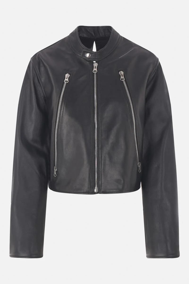 MM6 jacket made of black leather. It features a stand-up collar with a snap button, front zip closure, zippered pockets, long sleeves with zippered cuffs, a straight hem, a cut-out detail on the back, and a lined interior. The design is completed by the Maison's signature white stitching. Gender: Women Material: TESSUTO PRIMARIO: 100% BOVINE SKIN - LINING: 100% VISCOSE - LINING TASCHE: 100% COTTON Color: Black Made in: IT Product ID: S52AM0317M07005900 *Import tax/duty will be calculated at checkout (If applicable)