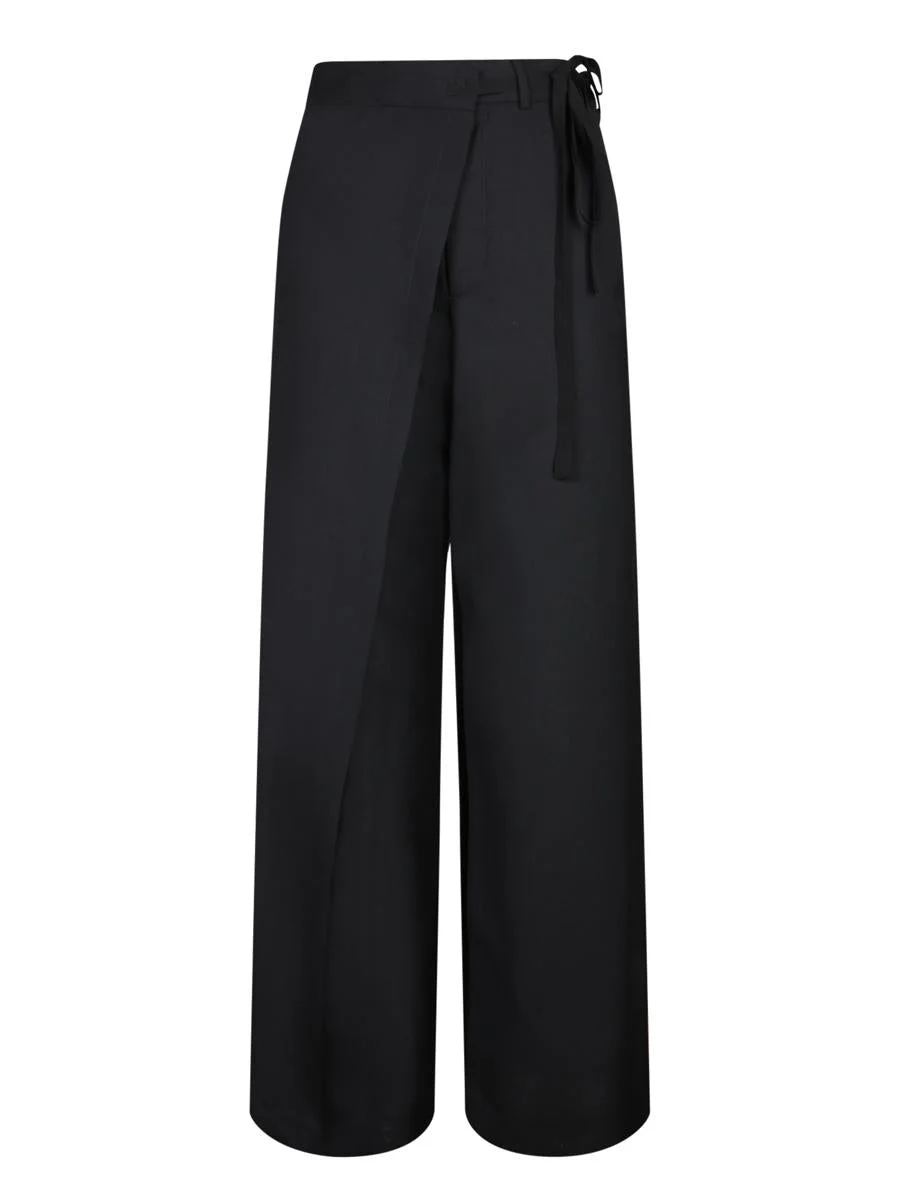 Black canvas trousers with pareo design. High waist with adjustable tie. Wide palazzo leg. Redefine everyday elegance with the MM6 Maison Margiela Black Canvas Pareo Trousers. This unique piece features a high tie-band that fits perfectly, paired with a wide-leg silhouette that provides both comfort and sophisticated style. Gender: Women Material: 100% WOOL Color: Black Made in: Imported Product ID: S52KA0518 M35080 900 *Import tax/duty will be calculated at checkout (If applicable)