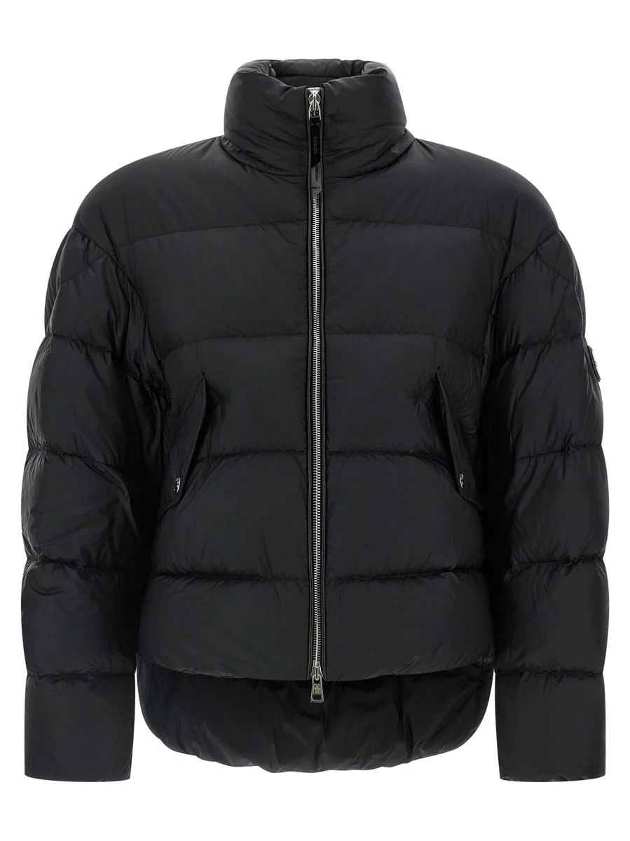 Moncler x Edward Enninful 'Blas' quilted nylon jacket with goose down padding, flared silhouette, high neck, front zip closure, pockets, long sleeves with elastic cuffs and tone-on-tone logo patch applique, side slits with snap buttons, drawstring on asymmetrical hem. Removable inner backpack braces to carry the garment without using your hands Gender: Women Material: 100% POLYAMIDE Color: Black Made in: Romania Product ID: K24031A00009M6526999 *Import tax/duty will be calculated at checkout (If applicable)