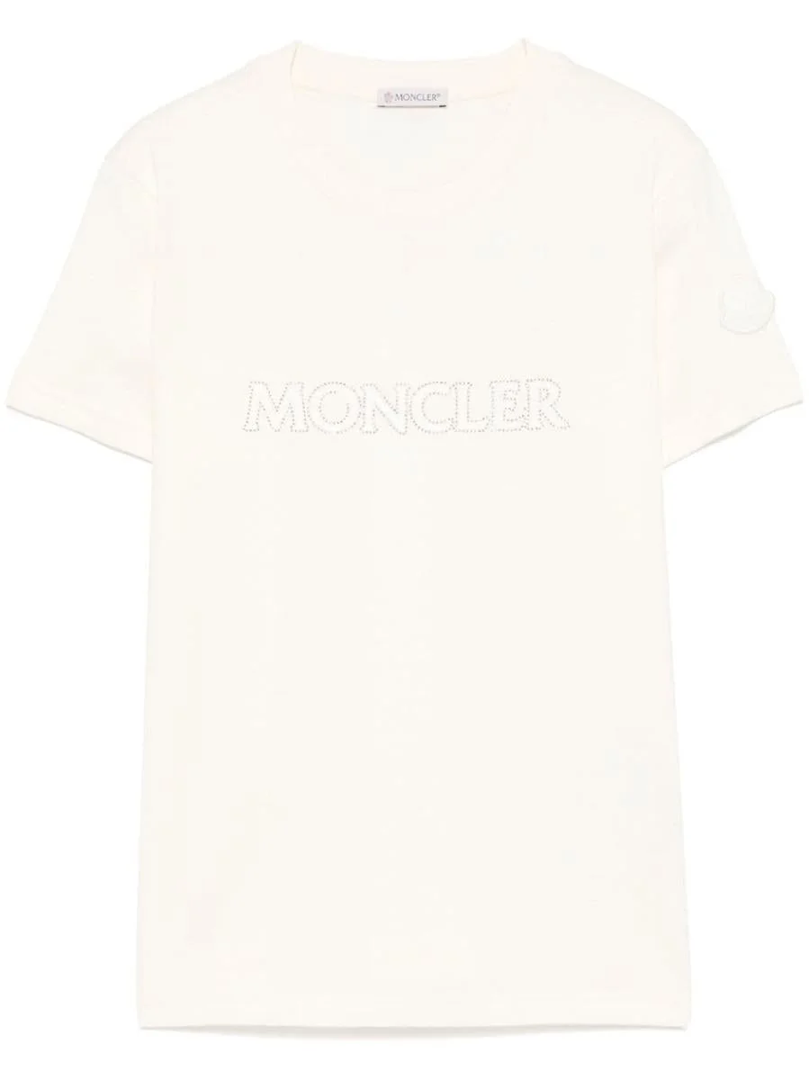 cream beige cotton jersey texture crystal-logo embellishment to the front ribbed crew neck short sleeves logo patch at the sleeve straight hem This piece fits true to size. We recommend you get your regular size Model is 1,75m / 5ft 8in wearing size S Gender: Women Material: COTTON 100% Color: WHITE Made in: TR Product ID: 8C0002189AIJ034 *Import tax/duty will be calculated at checkout (If applicable)
