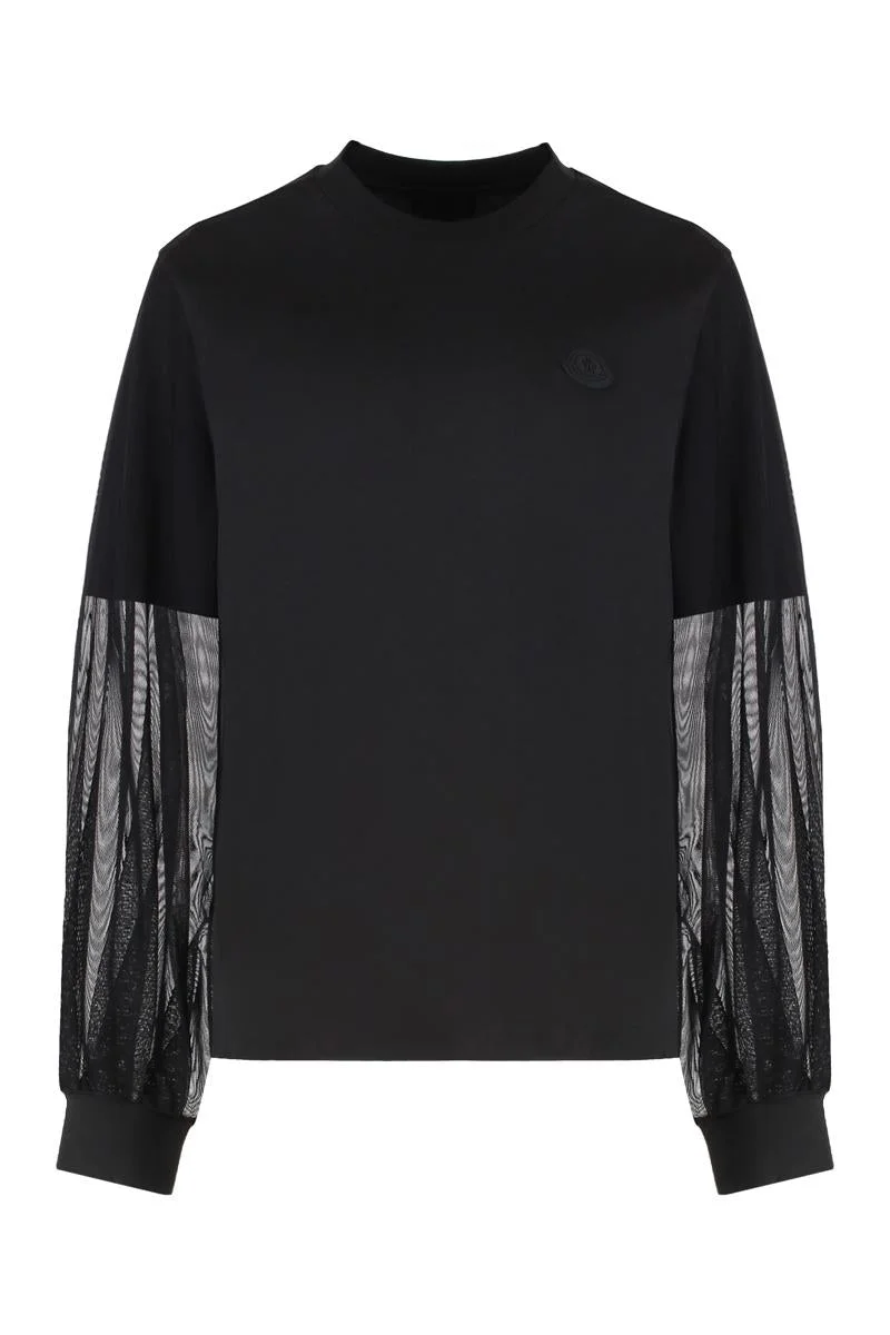 Long sleeve top in tulle This top in cotton jersey is reinterpreted with tulle sleeves, creating an appealing play of textures and volumes. The neckline is round, giving a classic touch to the garment. Perfect for being paired with denim or elegant trousers, ideal for casual or semi-formal outfits. 100% Cotton, 82% Polyamide, 18% Elastane Gender: Women Material: COTTON Color: Black Made in: Imported Product ID: K20938D0000589AYW_999 *Import tax/duty will be calculated at checkout (If applicable)