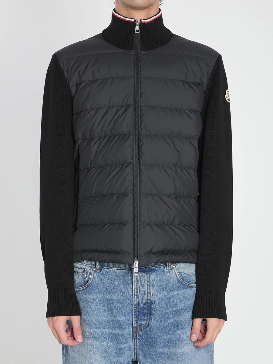 Padded cotton cardigan in black. Features a front panel with airsoft down padding, plain knit, fine wool gauge 7, collar with tricolor trim, zip fastening, zip pockets, and the iconic logo patch on the left sleeve. regular fit. The model is 188 cm tall and wears size M. Size nationality: INT Gender: Men Material: OUTER FRONT: 100% POLYETER; BASE FABRIC: 100% COTTON; FRONT LINING: 100% POLYESTER; FILLING: 90% GOOSE DOWN, 10% FEATHERS Color: Black Made in: Imported Product ID: 6262005 K20919B00003 M1367 999 *Import tax/duty will be calculated at checkout (If applicable)
