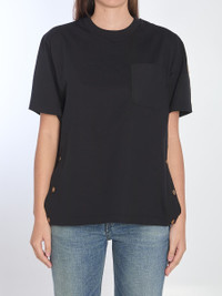 Crew-neck t-shirt in black cotton jersey with short sleeves. It features a patch pocket on the chest, side openings with logo snap buttons, a Moncler logo patch on the left sleeve, a ribbed crew neckline, and gathered detail at the back. Loose fit. The model is 179cm tall and wears a size S. Size nationality: INT Gender: Women Material: 100% COTTON Color: Black Made in: TR Product ID: 4571871 8C00020 89A4U 999 *Import tax/duty will be calculated at checkout (If applicable)