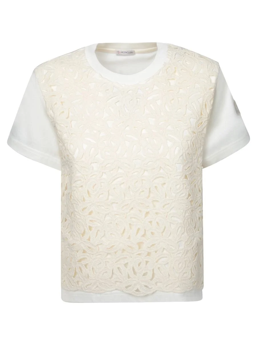 Short sleeve t-shirt. Cotton jersey fabric with crochet detailing. Finished crew neck. This exclusive Moncler t-shirt features a sophisticated crochet design that adds a touch of elegance to your casual wardrobe. Crafted from soft cotton jersey, it ensures both comfort and style. Gender: Women Material: 84%COTTON 16%POLYESTER Color: WHITE Made in: Imported Product ID: 8C00050 89AJU 034 *Import tax/duty will be calculated at checkout (If applicable)