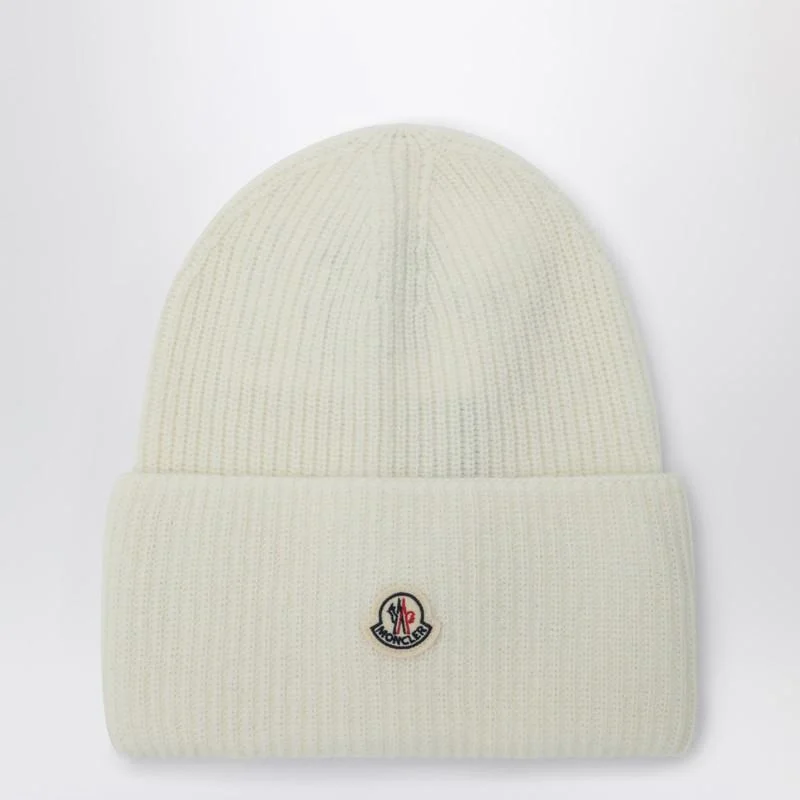 Moncler white wool beanie featuring ribbed design and turn-up with logo patch on the front. Gender: Women Material: 100% Lana Color: WHITE Made in: Italy Product ID: 3B00032M1241/R_MONCL-035 *Import tax/duty will be calculated at checkout (If applicable)
