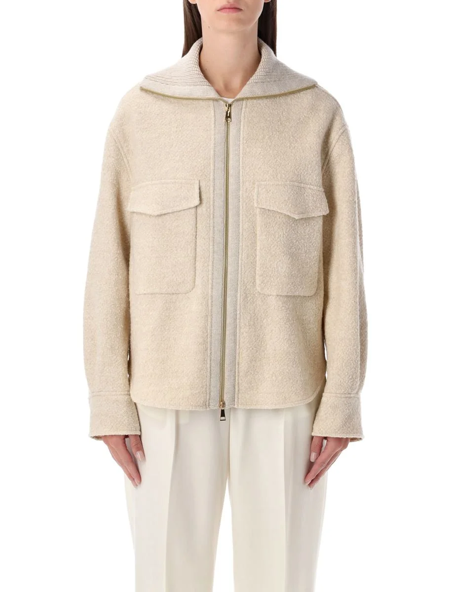 A refined take on a timeless silhouette, this Moncler shirt is crafted from a soft wool-blend boucle for warmth and elegance. The ribbed knit collar and zip fastening lend it a modern, sophisticated edge—ideal for transitional styling and everyday luxury. Wool-blend boucle fabric Front zip closure with gold-tone finish Ribbed knit collar Two flap chest pockets Cuffs with golden buttons Leather Moncler logo patch Alessandra is 1,75 m and wears size 40 Gender: Women Material: 62% WOOL 28% VISCOSE 10% POLYAMIDE Color: Beige Made in: Bulgaria Product ID: 25A2F00022597TE#268 *Import tax/duty will be calculated at checkout (If applicable)