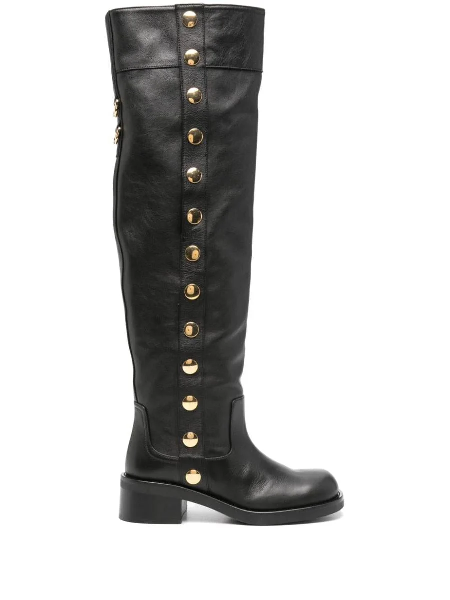 black calf leather panelled design gold-tone stud embellishment round toe D-ring findings above-knee length branded leather insole leather lining 50mm low block heel leather sole logo-engraved gold-tone hardware slip-on style Gender: Women Material: OUTER LEATHER100% ; LINING LEATHER 100% ; SOLE LEATHER 100% Color: Black Made in: IT Product ID: MA26065G1L MH5 000 *Import tax/duty will be calculated at checkout (If applicable)