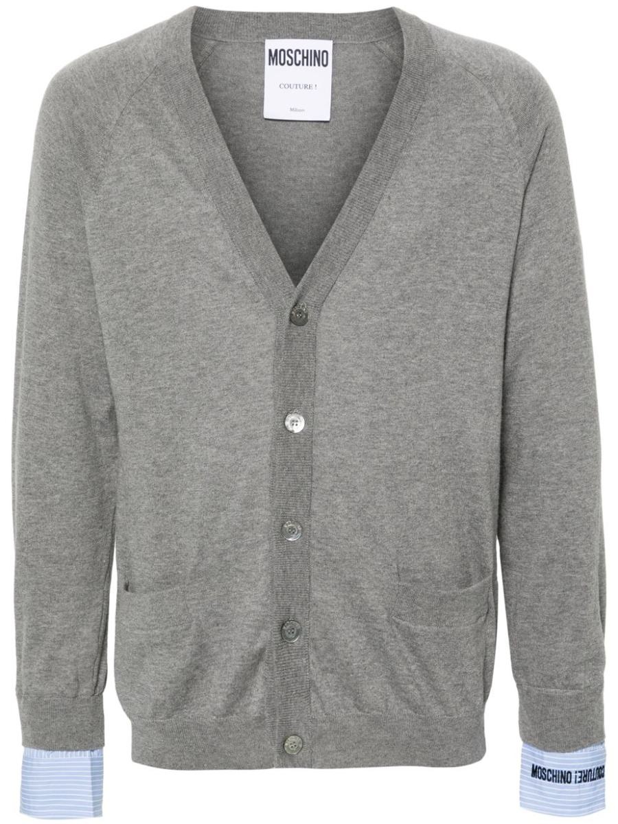 medium grey cotton-cashmere blend knitted construction fine knit ribbed V-neck long sleeves ribbed cuffs layered details buttoned cuffs two front pouch pockets ribbed hem front button fastening Gender: Men Material: COTTON 85% WOOL 15% Color: GREY Made in: IT Product ID: J0931 7005 0485 *Import tax/duty will be calculated at checkout (If applicable)