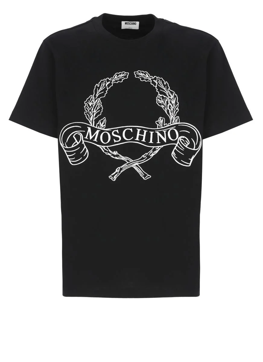 - Black Moschino cotton t-shirt for man - Crewneck - Short sleeves - Front contrasting color logoed embroidery Model's height is 190 cm and he wears a size L Gender: Men Material: 100% COTTON Color: Black Made in: Portugal Product ID: 072252411555 *Import tax/duty will be calculated at checkout (If applicable)