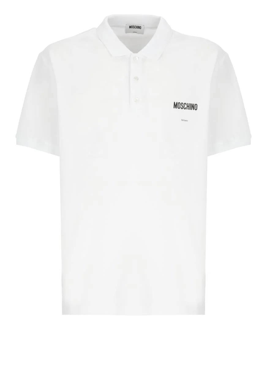- White Moschino cotton three-button polo shirt for man - Collar - Short sleeves - Front contrasting color logo Model's height is 190 cm and he wears a size 52 Gender: Men Material: 100% COTTON Color: WHITE Made in: Portugal Product ID: 160152421001 *Import tax/duty will be calculated at checkout (If applicable)