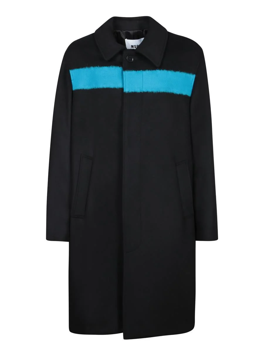 Coat with contrasting blue insert. Pointed collar and button closure. This stylish MSGM coat features a bold blue insert that adds a splash of color to the classic black design. It includes integrated side pockets and a sleek, modern silhouette. Gender: Men Material: 75% VIRGIN WOOLC 25% POLYAMIDE Color: Black Made in: Imported Product ID: 3940MC02 257603 99 *Import tax/duty will be calculated at checkout (If applicable)