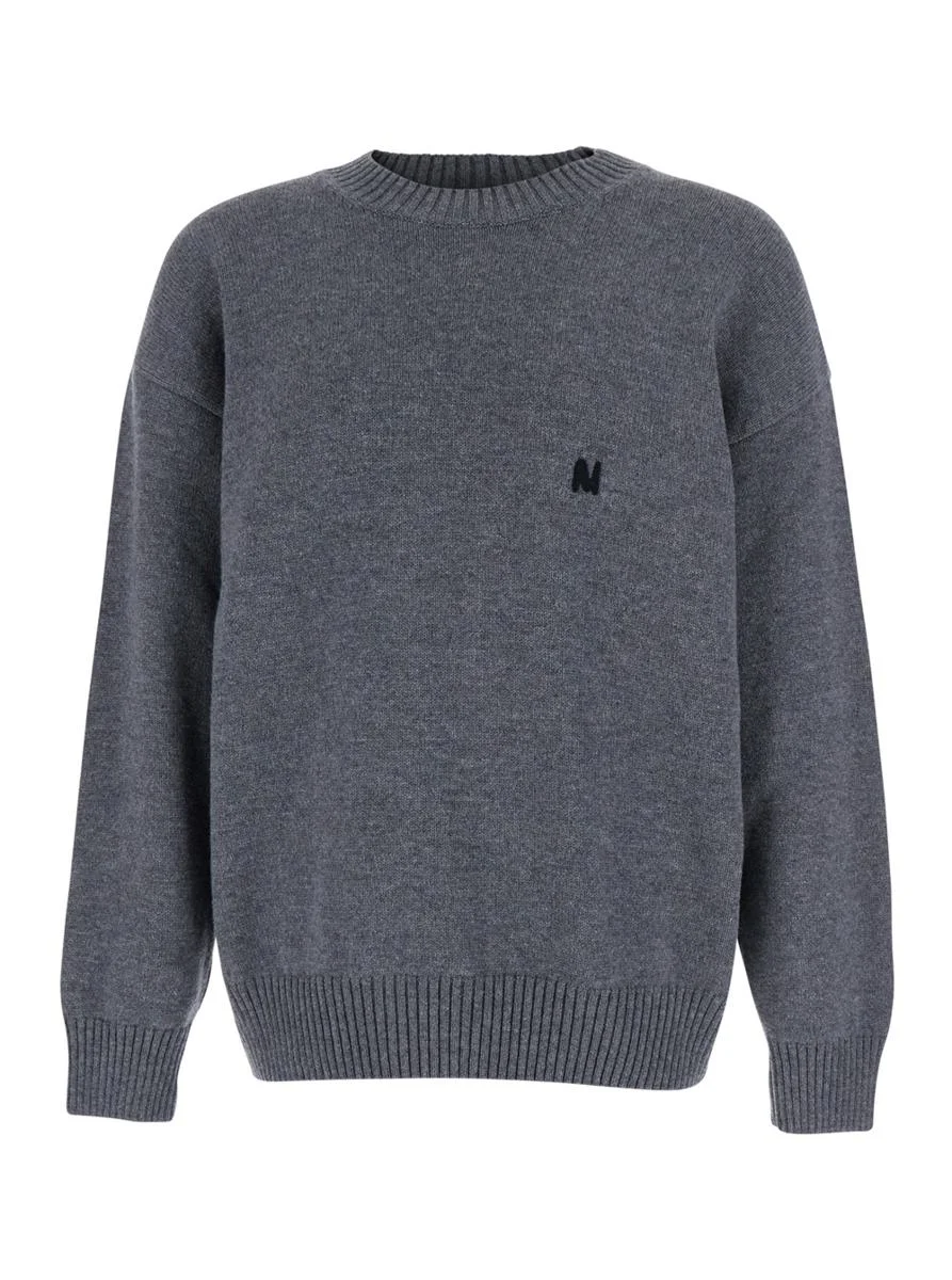 Msgm Grey Crew Neck Sweater With Front Logo In Wool Man