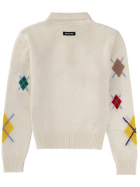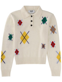Ivory long-sleeved polo shirt with multicolor argyle pattern