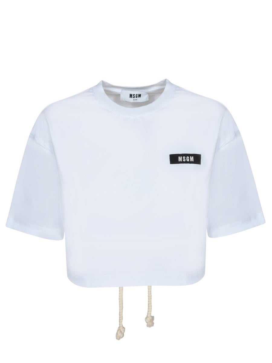 White crop T-shirt. Black MSGM logo on the front. Crew neck. Short sleeves. Essentiality meets contemporary design in this MSGM crop T-shirt, featuring a short cut and a bold black MSGM logo. Perfect for a youthful and dynamic look. Gender: Women Material: 100% COTTON Color: WHITE Made in: Imported Product ID: 3841MDM116 257002 01 *Import tax/duty will be calculated at checkout (If applicable)