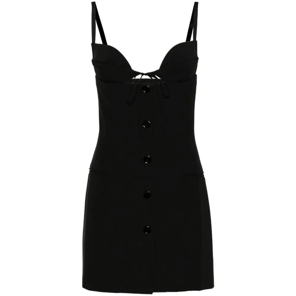 Black adjustable spaghetti straps sweetheart neck sleeveless front tie fastening to the chest cut-out detailing to the front two front jetted pockets thigh-length full lining straight hem front button fastening Gender: Women Material: POLYESTER: 53.0%, VIRGIN WOOL: 43.0%, ELASTANE: 4.0% Color: Black Made in: IT Product ID: SS24DR186 BLACK *Import tax/duty will be calculated at checkout (If applicable)