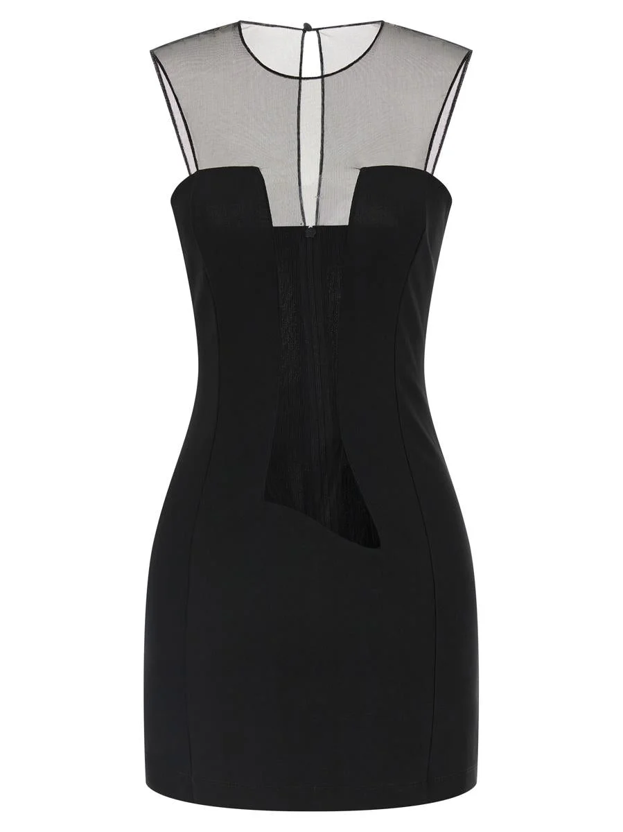 Sleeveless stretch viscose minidress with asymmetric tulle insert on the front and back, crewneck, button closure with cut-out teardrop detail and back zip Gender: Women Material: 83% VISCOSE 12% POLYESTER 5% ELASTANE Color: Black Made in: Imported Product ID: NDDR2641000100BLACK *Import tax/duty will be calculated at checkout (If applicable)