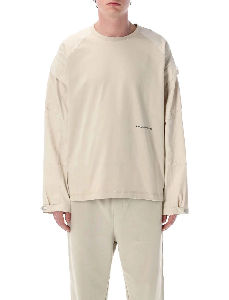 Cotton Peacemaker SI Cargo t-shirt by Peacemaker OAMC. Featuring: Ribbed crew neck Long sleeves with buttoned cuffs Logo print at front Flap pockets at sleeves Loose fit Model is 1,90 m and wears size L Gender: Men Material: 100% COTTON Color: Beige Made in: Imported Product ID: 25PPCM1OT07AJE003004#SAND *Import tax/duty will be calculated at checkout (If applicable)