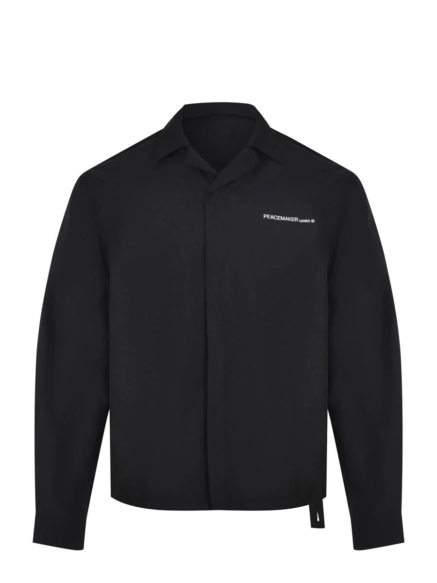 Peacemaker shirt OAMC made of a cotton blend in white. Classic collar. Long sleeves. Cuffs with snap buttons. Closure with snap buttons. Contrast embroidered logo lettering on the chest. Contrast embroidered print on the back. Gender: Men Material: POLYESTER Color: Black Made in: Imported Product ID: S03BPL001099 *Import tax/duty will be calculated at checkout (If applicable)