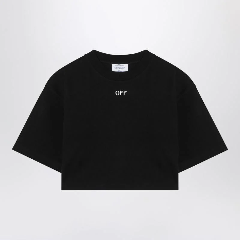 Black cotton cropped T-shirt from Off-White featuring short sleeves, a ribbed design and an embroidered OFF logo on the front. Gender: Women Material: 98% Cotton - 2% Elastane Color: Black Made in: IT Product ID: OWAA081C99JER004/Q_OFFW-1001 *Import tax/duty will be calculated at checkout (If applicable)