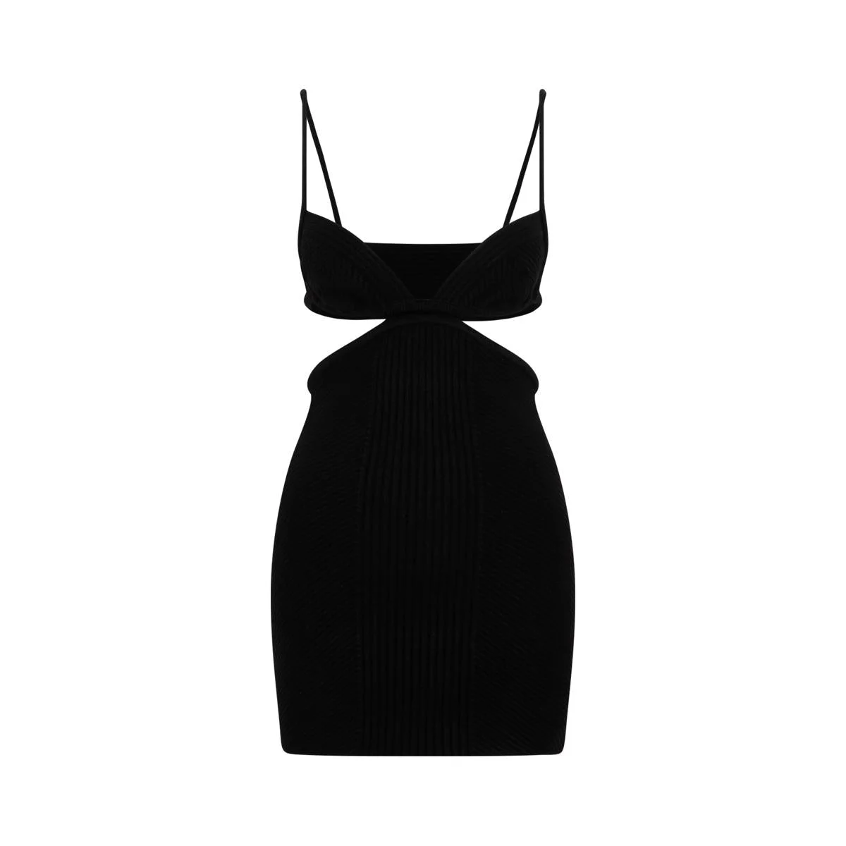 Off White Black Cut Out Ribbed Mini Dress. Crafted in a black viscose and tech fabric blend. Plunging neckline, spaghetti straps, side and back cut-outs, ribbed construction, straight hem. Gender: WOMEN Material: 65%VISCOSE 25%POLYESTER 8%POLYAMIDE 2%ELASTANE Color: Black Made in: IT Product ID: OWHI080S23KNI001_1000 *Import tax/duty will be calculated at checkout (If applicable)