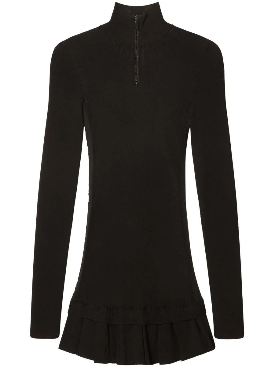 Presented in black, this minidress by Off-White boasts a fine-knit construction that opens to a narrow pleated skirt. Designed for a fitted silhouette, it features a high-neck and comes with a short front zip. Highlights black knitted construction high neck short front zip fastening long sleeves pleated skirt straight hem Gender: Women Material: FABRIC 100% WOOL Color: Black Made in: Imported Product ID: OWHI104F23KNI001 1010 BLACK *Import tax/duty will be calculated at checkout (If applicable)