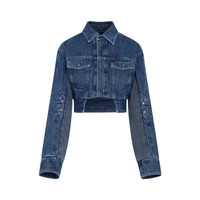 Off White Blue Motorcycle Hole Crop Jacket. Crafted in pure blue cotton denim. Pointed collar, long sleeves, motorcycle jacket-inspired construction on the sleeves, front concealed fastening, two flap chest pockets, front round cut-out, cropped length, Off White logo embroidered on the sleeve, asymmetrical hem. Gender: Women Material: 100%COTTON Color: BLUE Made in: IT Product ID: OWYE044S23DEN001_4500 *Import tax/duty will be calculated at checkout (If applicable)