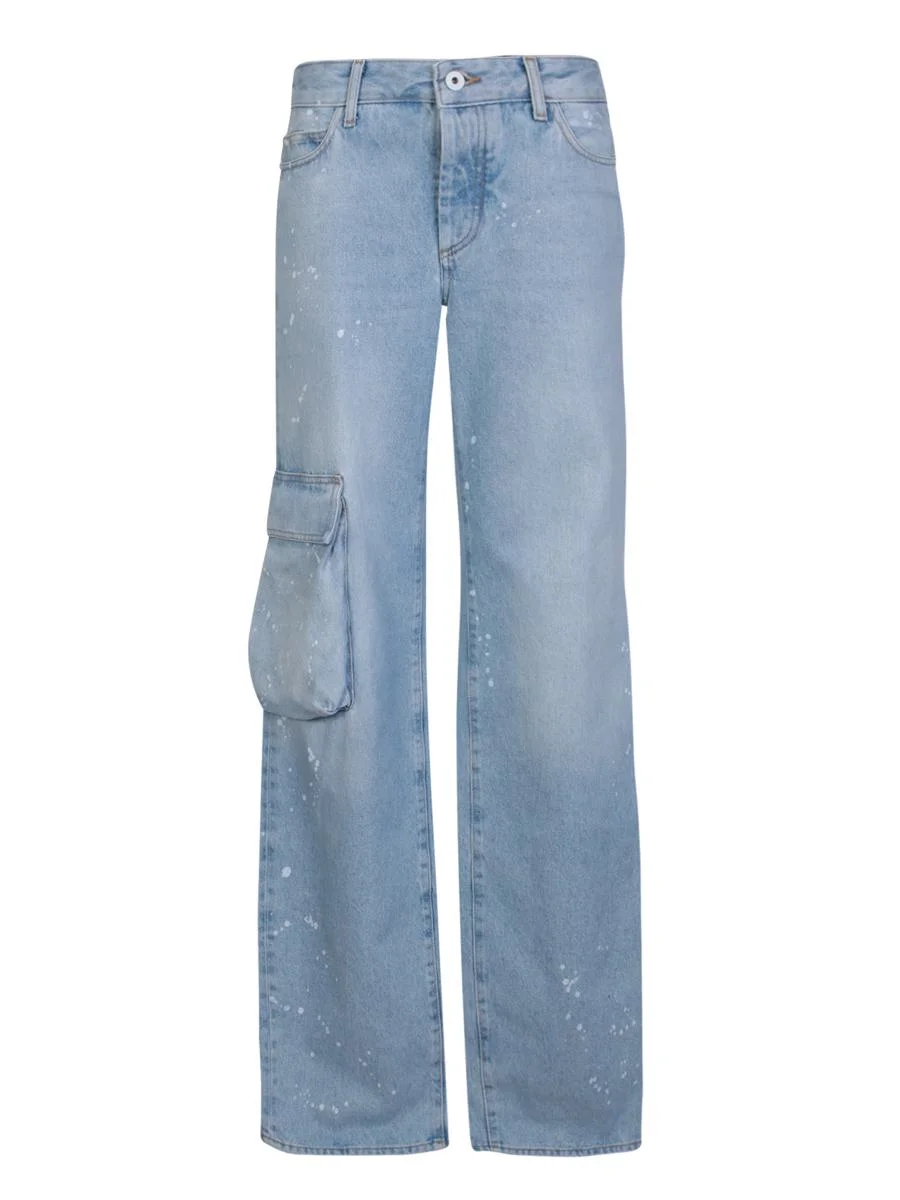 Light blue cotton cargo jeans with painted detail from Off-White Belt loops. Zip and button fastening. Classic five pockets. Side patch pocket. White painted detail. Colour: Light Blue Material: 100% Cotton Cotton and patent leather cargo jeans by Off-White Gender: Women Material: 100% COTTON Color: BLUE Made in: Imported Product ID: OWYB014S23 DEN001 4001 *Import tax/duty will be calculated at checkout (If applicable)
