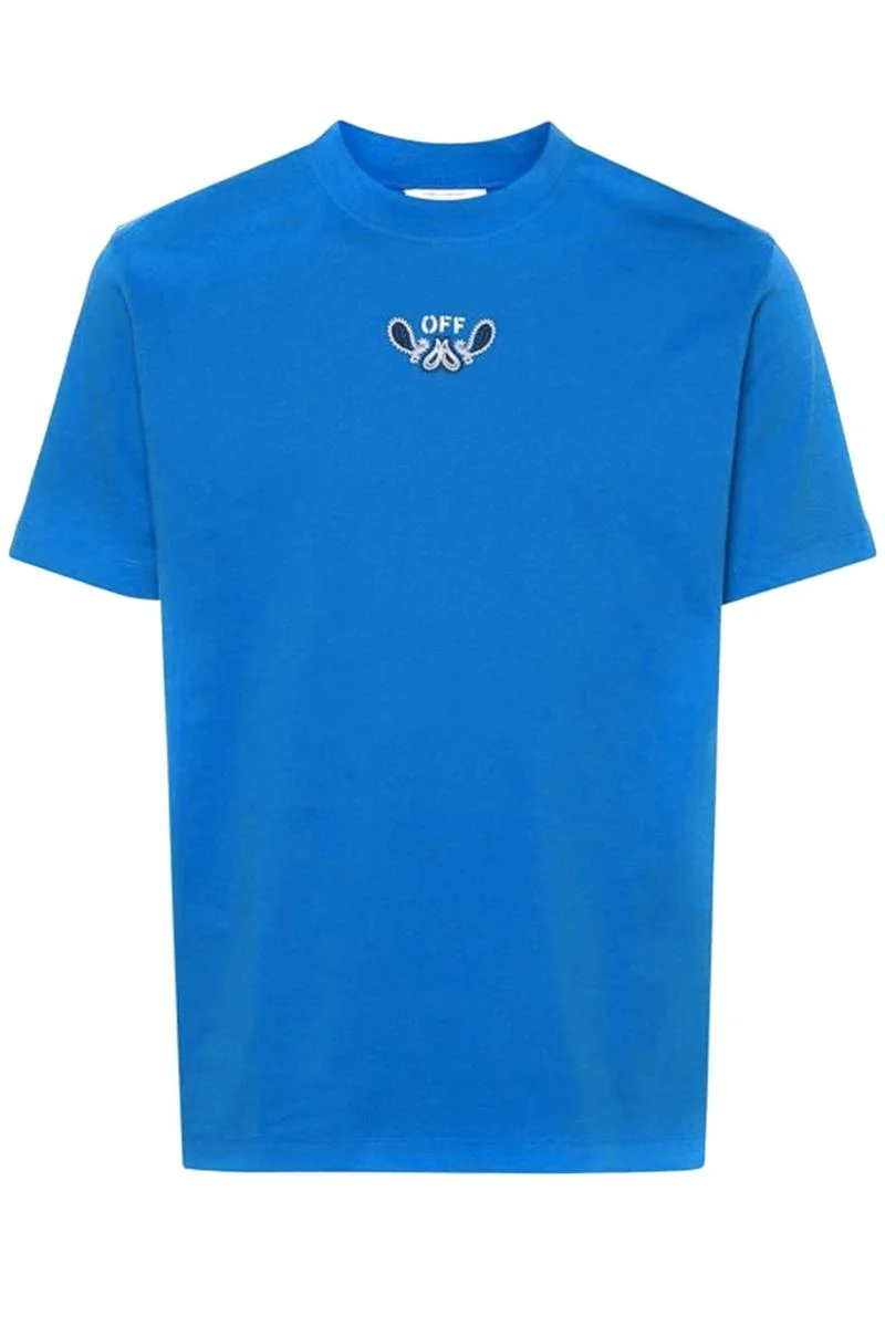 Regular fit, ribbed crew neck, 'OFF' logo and 'Paisley' embroidery on the front, 'Arrow' pattern with repeated embroidery at the back Gender: Men Material: 100% cotton Color: BLUE Made in: PT Product ID: OMAA027S24JER0014601 *Import tax/duty will be calculated at checkout (If applicable)