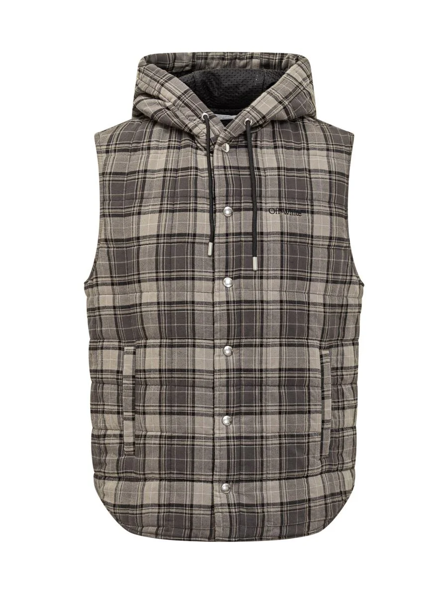 Off-White padded gilet in beige and black plaid fabric with adjustable hood and snap button closure. Gender: Men Material: OUTSIDE:100% COTTON INSIDE:100% POLYESTER Color: GREY Made in: Italy Product ID: OMGA22BF25FAB001 0710 *Import tax/duty will be calculated at checkout (If applicable)