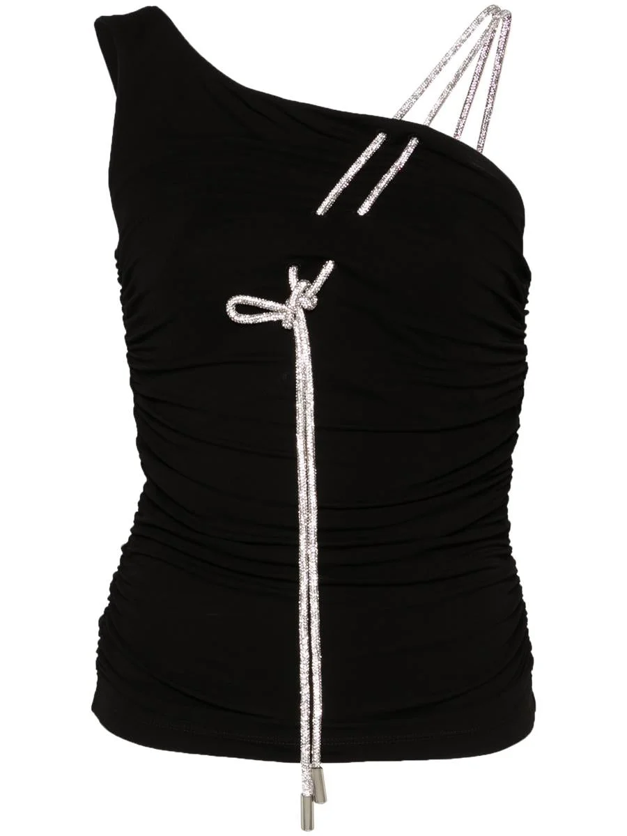 Highlights black stretch-design crepe texture asymmetric neck sleeveless crystal embellishment single shoulder strap ruched detailing draped design knot detailing curved hem unlined   Made in Italy. Gender: Women Material: 5% ELASTANE 95% VISCOSE Color: BLACK/BLACK Made in: Imported Product ID: OWAD253F24JER001 1010 BLACK/BLACK *Import tax/duty will be calculated at checkout (If applicable)