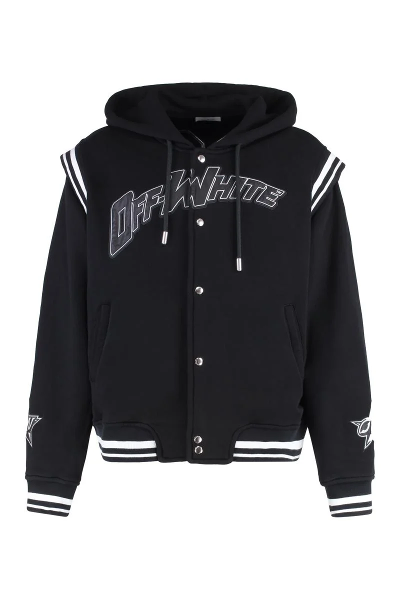 OFF-WHITE'S COTTON VARSITY HOODIE COMBINES COMFORT WITH DISTINCTIVE STYLE. FEATURES A FRONT SNAP-BUTTON CLOSURE AND AN ADJUSTABLE DRAWSTRING HOOD. THE TWO SIDE WELT POCKETS OFFER CONVENIENCE, WHILE THE RIBBED HEMS AND CUFFS ENSURE A COMFORTABLE FIT. THE GARMENT IS EMBELLISHED WITH PATCHES ON THE FRONT AND BACK WITH THE ICONIC LOGO, GIVING IT A TRENDY STREETWEAR LOOK. A MUST-HAVE FOR THOSE LOOKING FOR ELEGANCE AND ORIGINALITY IN A CASUAL GARMENT. STANDARD Gender: Men Material: COTTON Color: Black Made in: PT Product ID: OMEK003S25JER002_1040 *Import tax/duty will be calculated at checkout (If applicable)