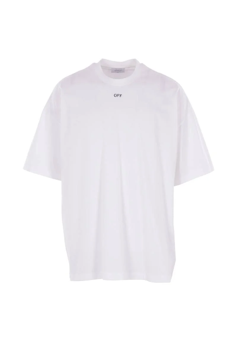 Off White oversized t-shirt crafted from white cotton jersey, featuring an Off print on the chest and Dots Logo print on the back. Designed with a crew neckline, short sleeves, and straight hem. Gender: Men Material: FABRIC 100% COTTON - RIB DETAILS 5% ELASTANE 95% COTTON Color: WHITE+BLACK Made in: Portugal Product ID: OMAA161F25JER0020110 *Import tax/duty will be calculated at checkout (If applicable)