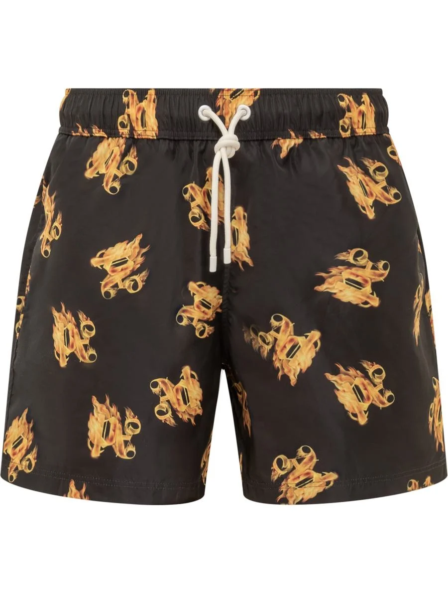 Black swimsuit. Drawstring waistband. Pockets at sides. Flap pocket at back. 'Burning' monogram with gold flames printed on front. Inside mesh. Gender: Men Material: 100% POLYESTER Color: Black Made in: IT Product ID: PMFD002R24FAB005 1076 *Import tax/duty will be calculated at checkout (If applicable)