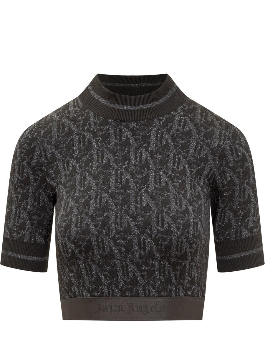 Knit top. Monogram All-Over. Short sleeves. Crew neck. Ribbed collar and hems. Elastic band at waist with Palm Angels logo. Gender: Women Material: 86% VISCOSE 12% POLYESTER 2% POLYAMIDE Color: Black Made in: IT Product ID: PWHT010R24KNI001 1010 *Import tax/duty will be calculated at checkout (If applicable)